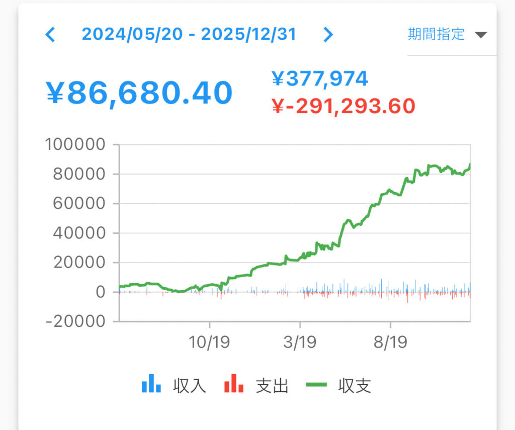もともとスロットは好きで趣味で打っていましたが兼業(副業)として増やそうと決めた日からの収支表です。+86680円ではなく86680枚です。1枚当たりのレートは基本20円なので単純計算で86680枚×20円=1733600円増えたことになります。0.4は「5円スロット」の分が含まれています。換金するのに手数料がとられてしまい、実際の金額ではもう少し少ないですが好きなことで増やせているなら自分は満足です。(笑)